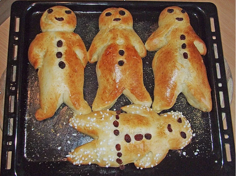 The traditional St. Martin’s Day feast features roasted goose, but for our family, it’s all about the delicious Weckmann. We make them in the morning and enjoy them in the afternoon with tea or cocoa. A Weckmann is basically sweet bread shaped like a gingerbread man. In Germany they’re easy to find – we talked to one small bakery that said they make over 2000 of them on St. Martin’s Day. But just in case you don’t happen to be there next week, try this recipe. Making them with the kids is just as much fun as eating them anyway.